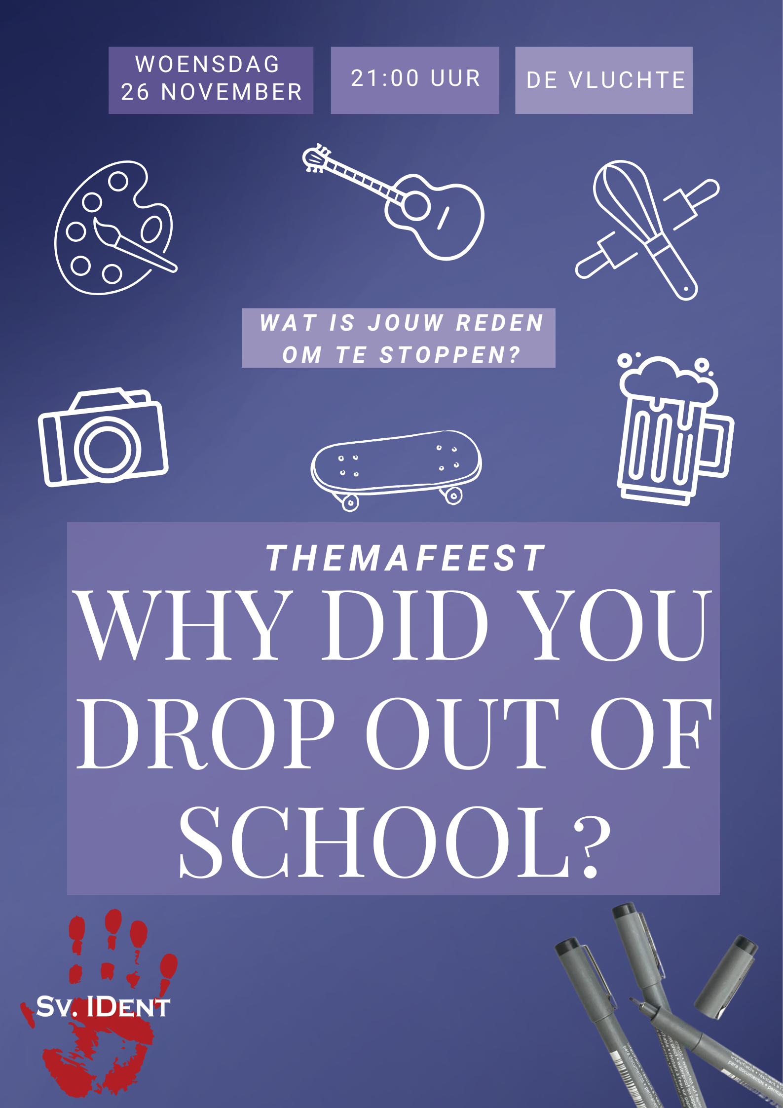 Trek je beste school drop-out look aan: van verwarde artiest tot vrije geest of luie legende, en kom laten zien wat jouw reden was om te stoppen! 😎 Kortom: geen cijfers, geen stress, alleen een goed verhaal en nog betere drankjes. Tot dan, ex-studenten (voor één nacht)! 🎉